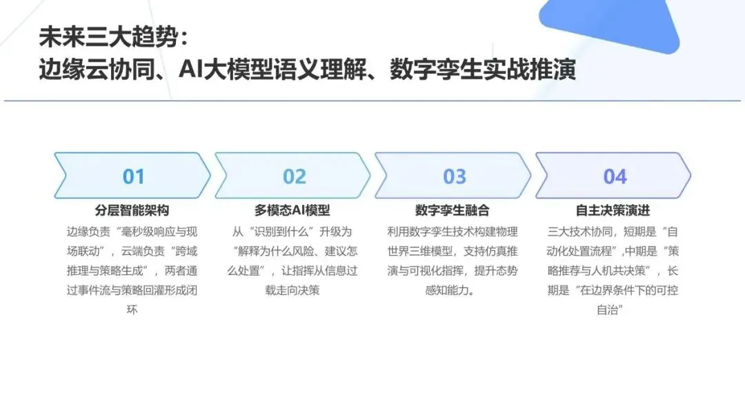 简单总结一下未来的三大技术趋势:第一是边缘云协同,边缘部分负责毫秒级响应,云端负责更大型的工作,包括跨域推理、策略生成,两者通过事件流和策略回灌形成闭环态势。