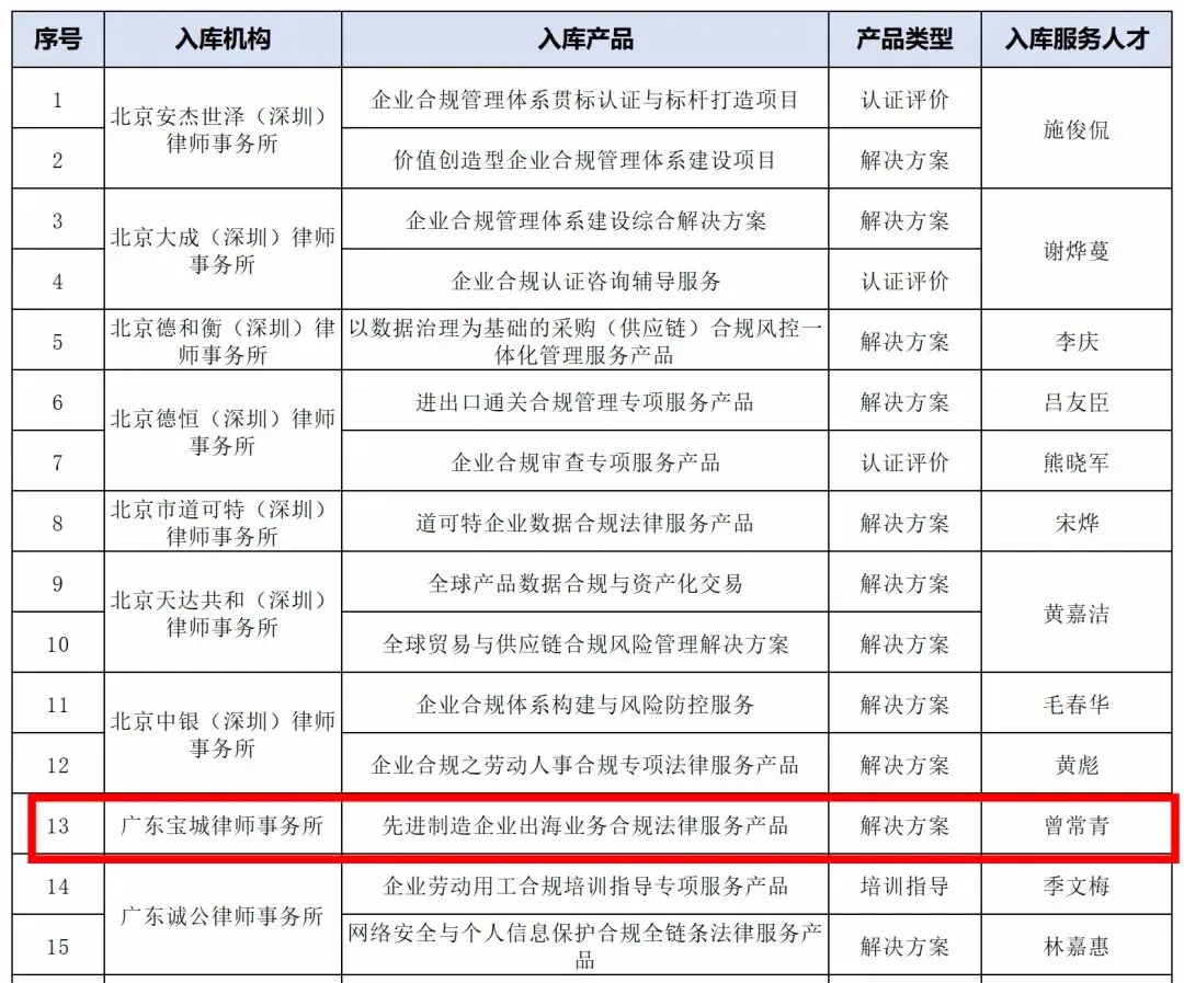 广东宝城律师事务所入选首批深圳市企业合规服务机构库,“先进制造企业出海业务合规法律服务产品”入选产品库,宝城所党总支书记、主任、高级合伙人曾常青律师入选专业人才库。