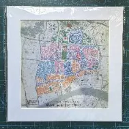 以现代广州市中心路网肌理为底图,突出城墙内部分,并根据不同区域在古代的城市功能配不同颜色,整体呈现出多彩的视觉效果。成品配画框装裱。