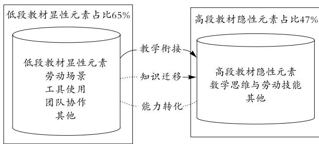 图1显示,小学低学段教材中,直观的劳动内容占整体教材内容的,多与学生的劳动体验结合。随着年级升高,教材中的劳动教育元素更多体现数学思维与劳动技能的深层联系。这种多维度分析揭示了劳动教育元素在教材中的分布规律,为后续优化教学设计提供了明确的方向。