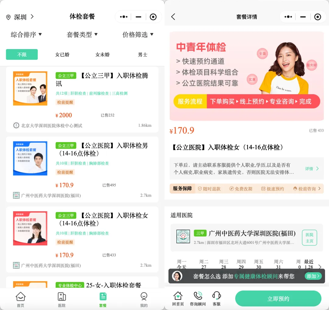 还可筛选距离远近、医院等级、价格高低等,快速找到自己需要的体检套餐。