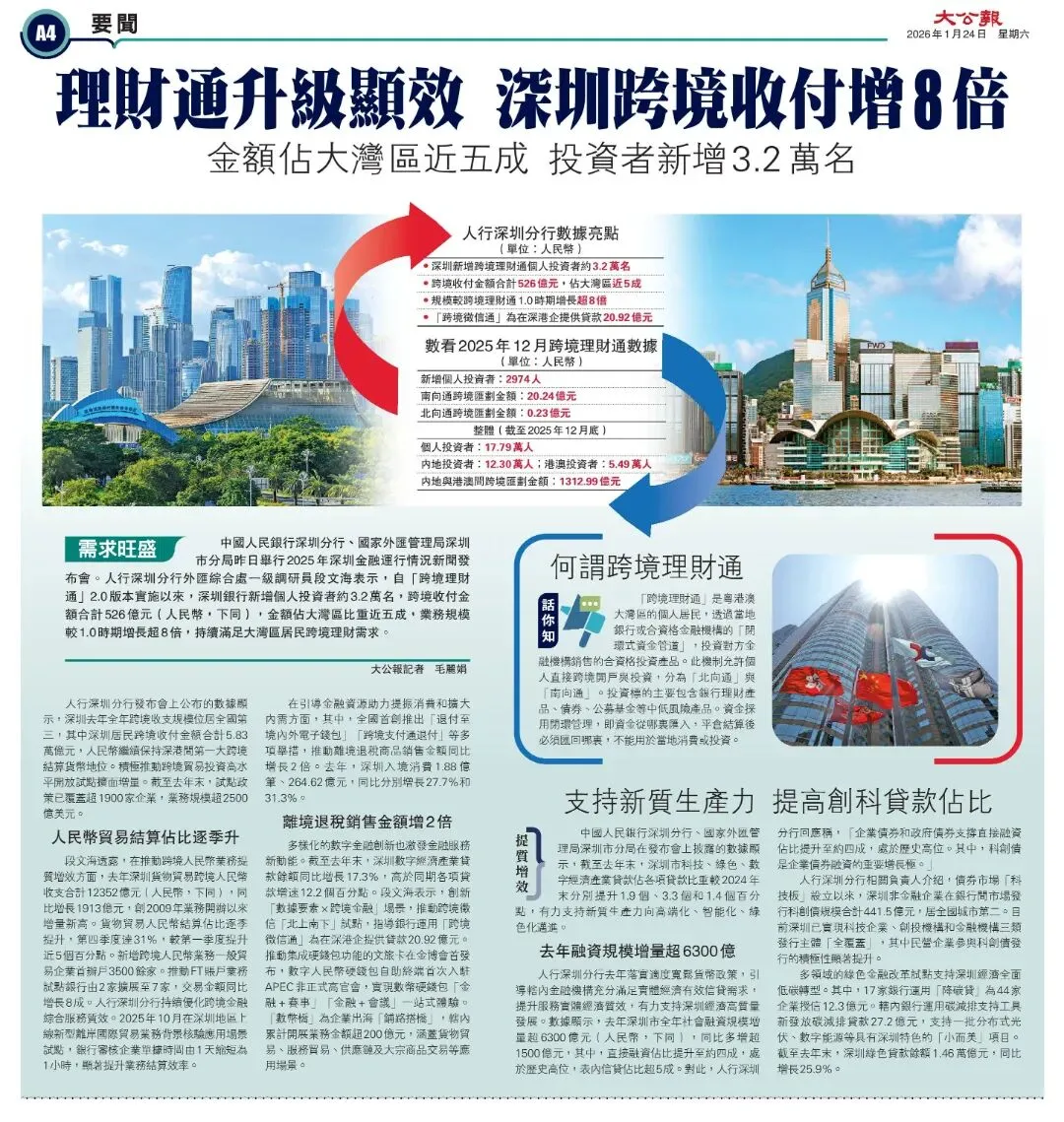 货物贸易人民币结算量增面扩。2025年,深圳货物贸易跨境人民币收支合计12352亿元,同比增长1913亿元,创2009年业务开办以来增量新高。货物贸易人民币结算占比逐季提升,第四季度达31%,较第一季度提升近5个百分点。新增跨境人民币业务一般贸易企业首办户3500余家。推动FT账户业务试点银行由2家扩展至7家,交易金额同比增长8成。自“跨境理财通”2.0版本实施以来,深圳银行新增个人投资者约3.2万名,跨境收付金额合计526亿元,金额占大湾区比重近5成,业务规模较1.0时期增长超8倍,持续满足大湾区居民跨境理财需求。