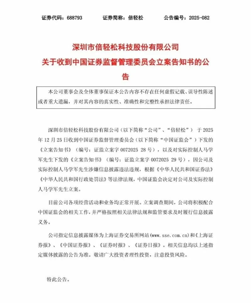 在业绩巨亏的同时,倍轻松还因实控人风波陷入监管漩涡,公司内控问题也随之暴露。2025年12月25日晚间,倍轻松披露公告称,公司及实际控制人马学军收到中国证监会下发的《立案告知书》,因涉嫌信息披露违法违规,证监会决定对公司及马学军立案调查。