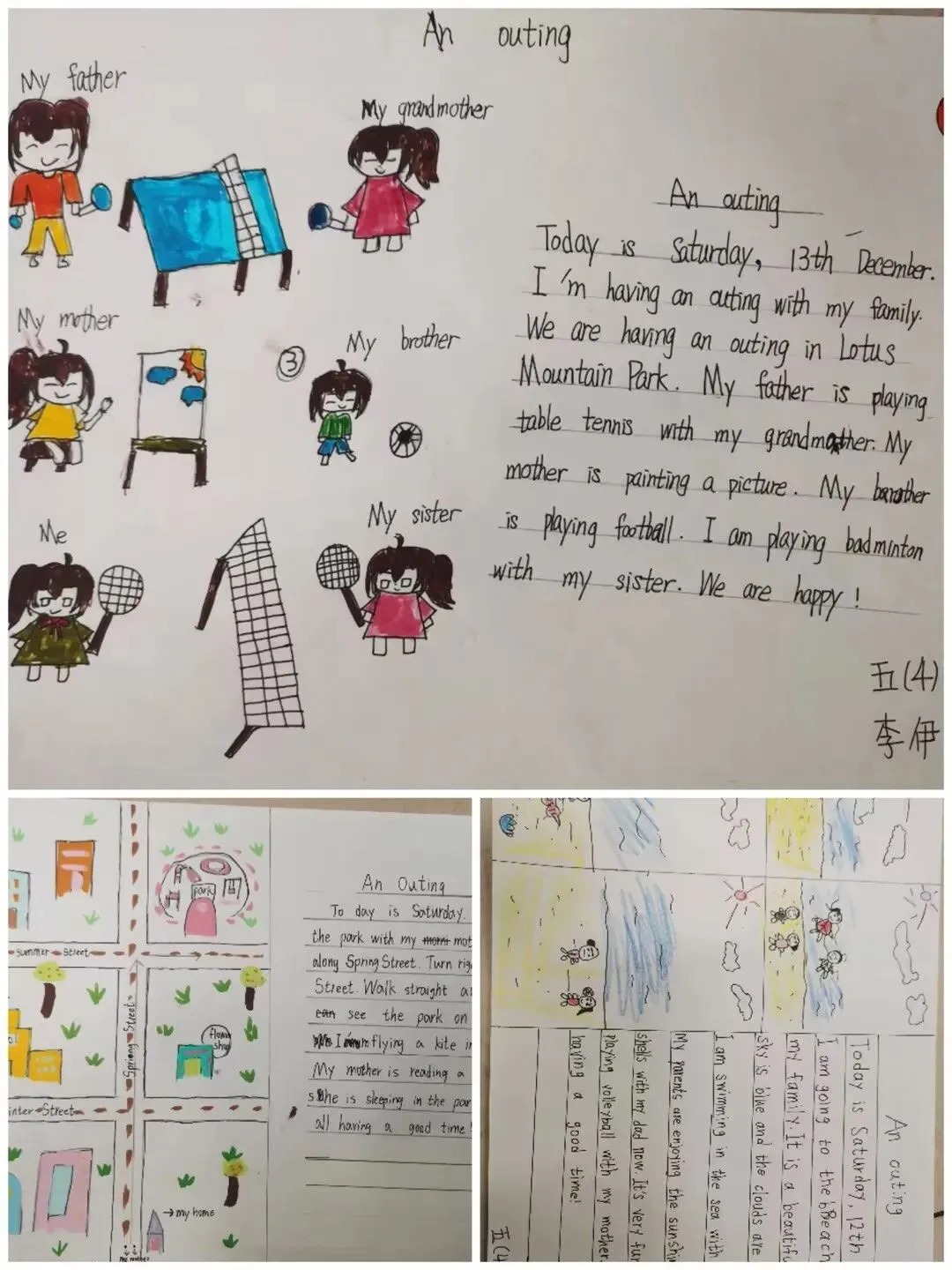 五、六年级的活动注重培养学生合作能力。五年级利用小组合作设计游览“动物园一日”路线、模仿课文开展英文交流;六年级则以单元主题为依托,开展多元化作品创作活动,海报、调查报告、手抄报、思维导图等丰富形式,在实践中培养自主学习与探究能力,彰显了高阶思维素养。