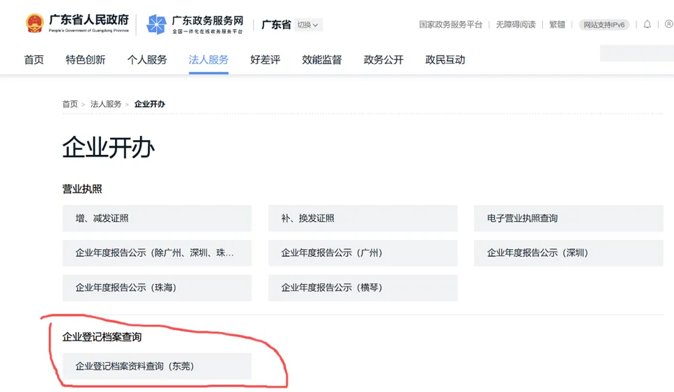 访问广东政务服务网(https://www.gdzwfw.gov.cn/),选择“法人服务”栏目下的“企业开办”项目,找到“企业登记档案查询(东莞)”功能。