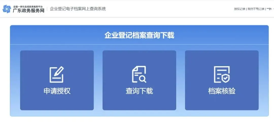 在收到办结短信后,登录广东政务服务网,进入“企业登记档案查询下载”页面。点击“查询下载”。