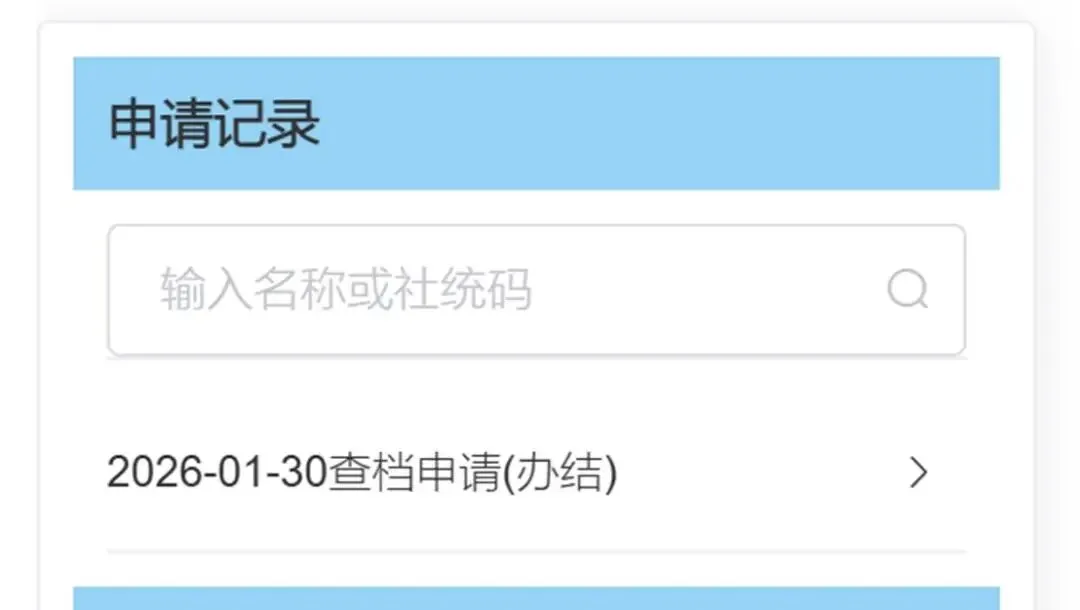 然后,就会看到申请记录下,有一个查档申请(办结)。点击这个申请,在右边就能看到企业的相关档案。