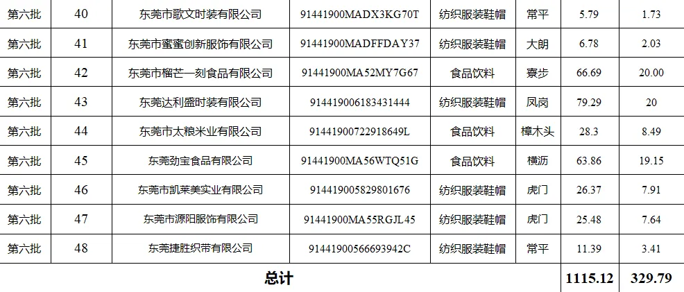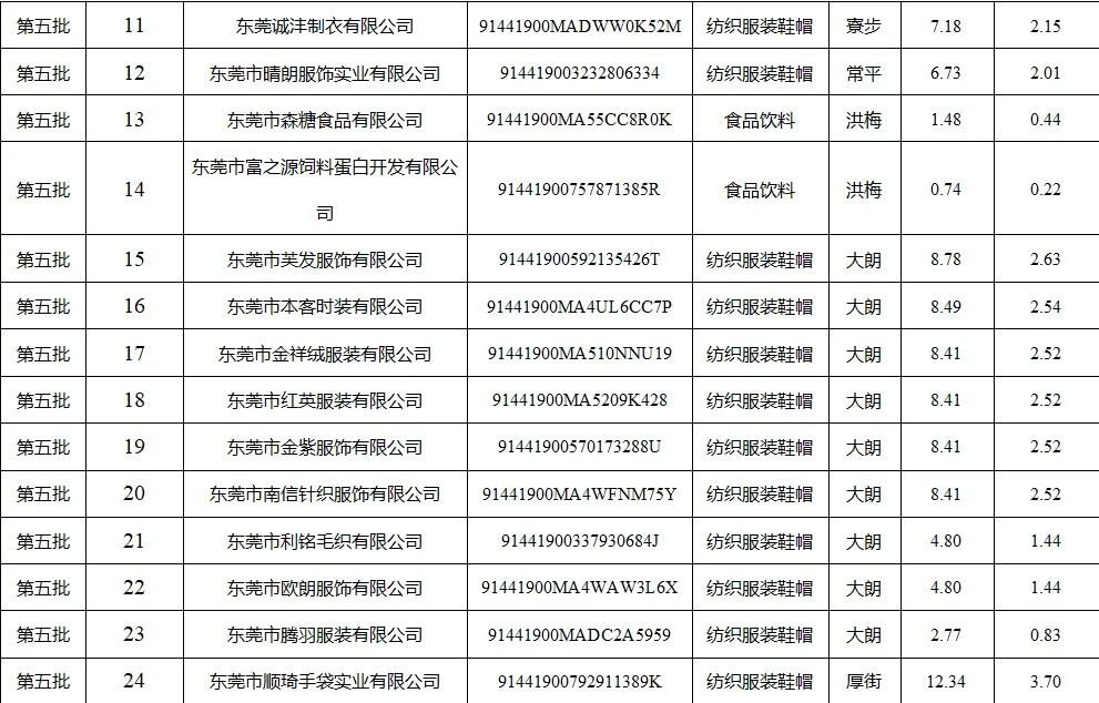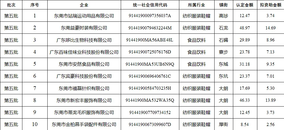 2025年第五、六批东莞市中小企业数字化转型城市试点专项资金中小企业数字化改造项目(纺织服装鞋帽、食品饮料行业)资助资金明细表