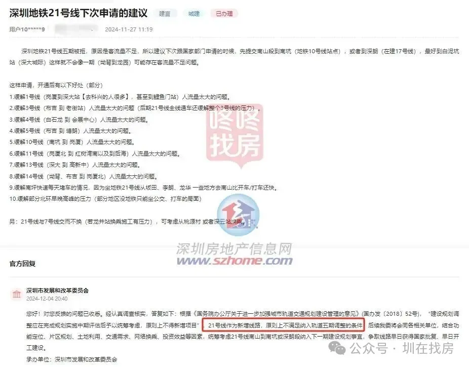 2024年11月,有网友留言21号线5期未批,下次申请的时候,可先提交南南山段到南坑(地铁10号线站点),这样就不会存在流量不足问题。