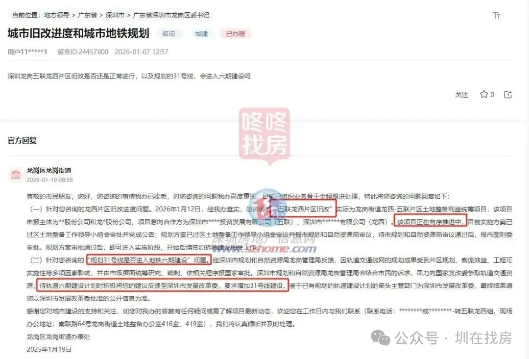 此外,近日有五联龙西片区市民咨询城市旧改进度和城市地铁规划。提到深圳龙岗五联龙西片区旧改是否还是正常进行,以及规划的31号线,会进入六期建设吗?