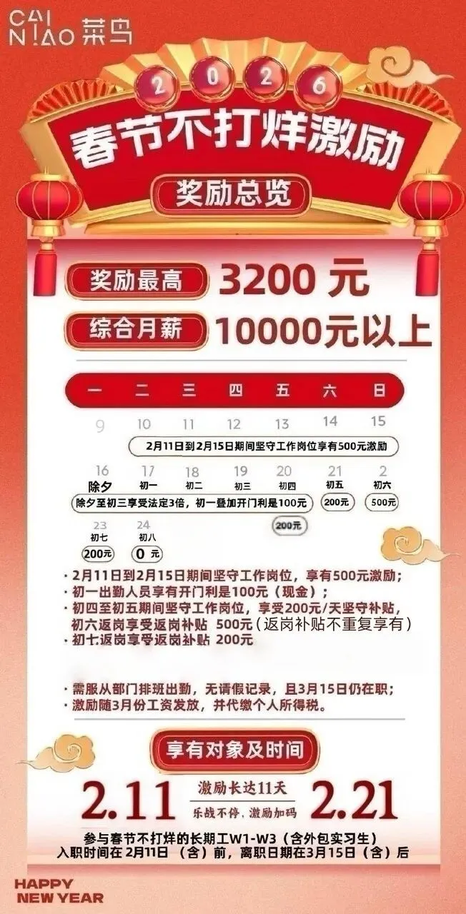 跨年寒假工:18元/时+星级奖励1-6元/时,除夕到初八额外还有3元/时的留年奖励,最高可达27元/时,至少做到2月26号,每周有预支正式工:18元/时+星级奖励1-6元/时,最高可达24元/时,后续转正式工,综合工资7000-9000元每月,每周可预支500元花都菜鸟—维龙仓留年奖最高3200元