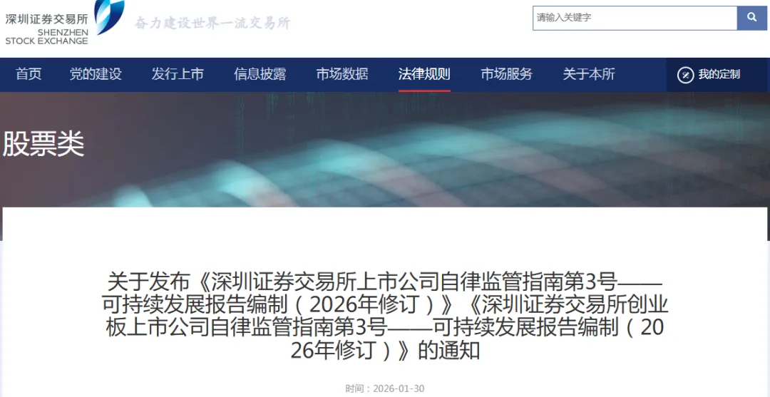 1月30日,为贯彻党的二十届三中、四中全会精神,落实新“国九条”部署,引导上市公司积极践行可持续发展理念,进一步规范上市公司可持续发展信息披露,推动《上市公司自律监管指引第17号——可持续发展报告(试行)》(以下简称《指引》)落地实施见效,在中国证监会统筹指导下,深交所发布实施《深圳证券交易所上市公司自律监管指南第3号——可持续发展报告编制(2026年修订)》《深圳证券交易所创业板上市公司自律监管指南第3号——可持续发展报告编制(2026年修订)》(以下统称《指南》)。