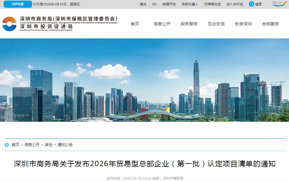 为贯彻落实《深圳市商务局关于支持贸易型总部企业发展的实施意见》(深商务规〔2023〕1号),支持贸易龙头企业发展,我局开展了2026年贸易型总部企业(第一批)认定工作。经核查确认,现发布2026年贸易型总部企业(第一批)认定项目清单。