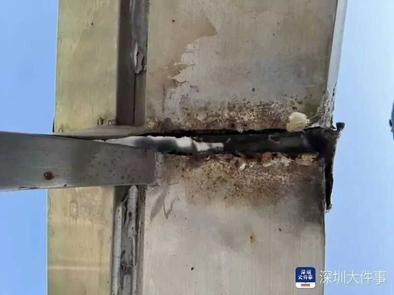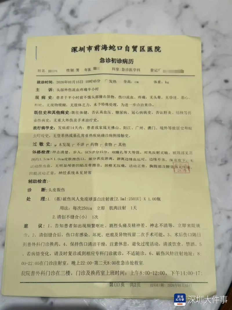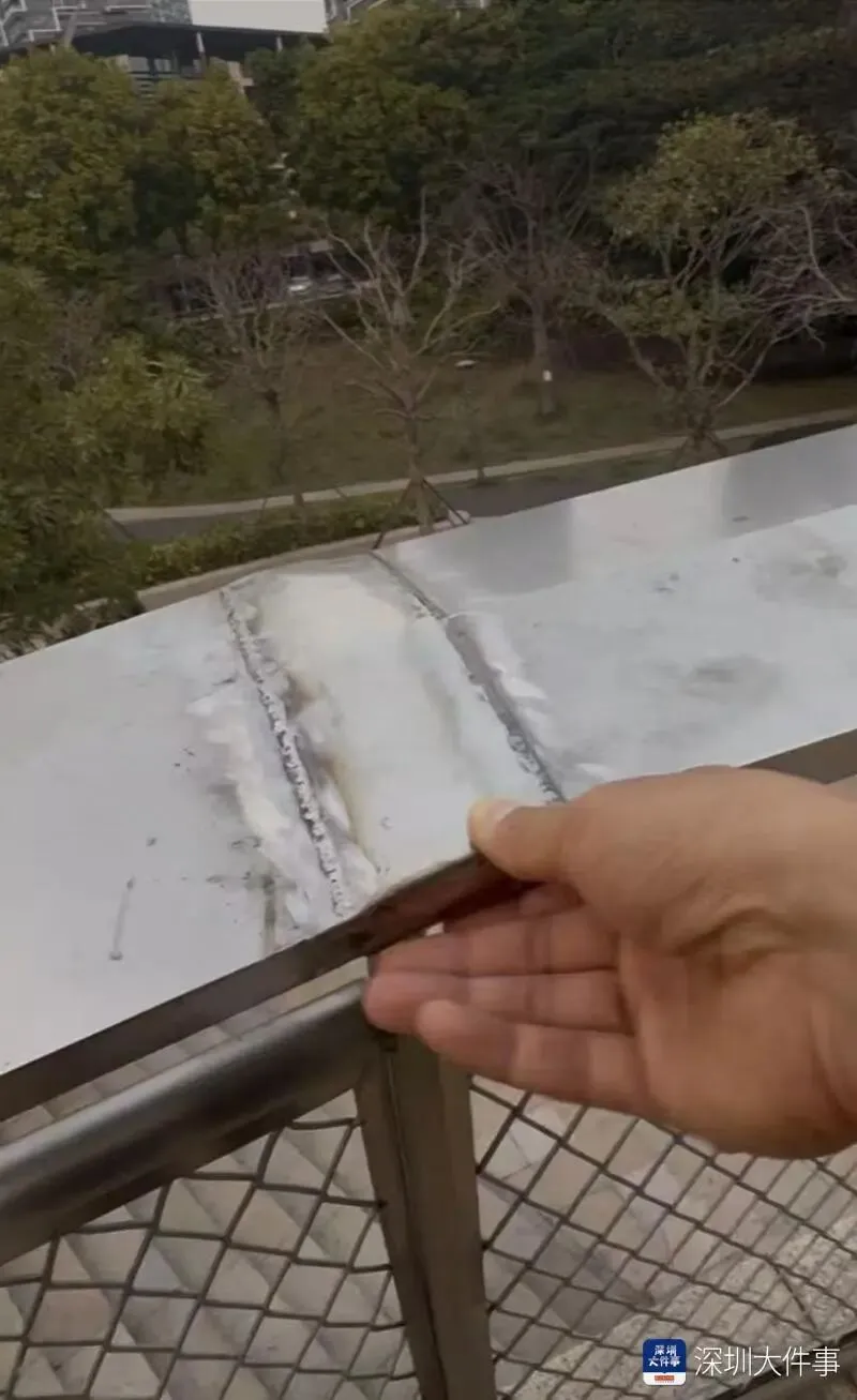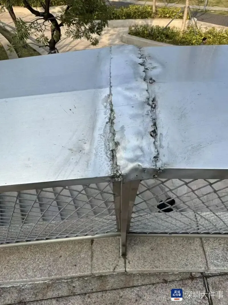 1月15日上午,市民张先生在深圳湾滨海休闲带散步,蹲下拍摄风景后起身时,头部不慎撞到坡道护栏扶手。张先生发现,该处护栏扶手拼接位置的焊缝出现开裂与脱焊,金属连接处锈蚀、边缘突出尖锐,撞击后导致其头部出现约1.5厘米的挫裂伤口,随即前往医院急诊处理,诊断为"头皮裂伤",打了破伤风针。