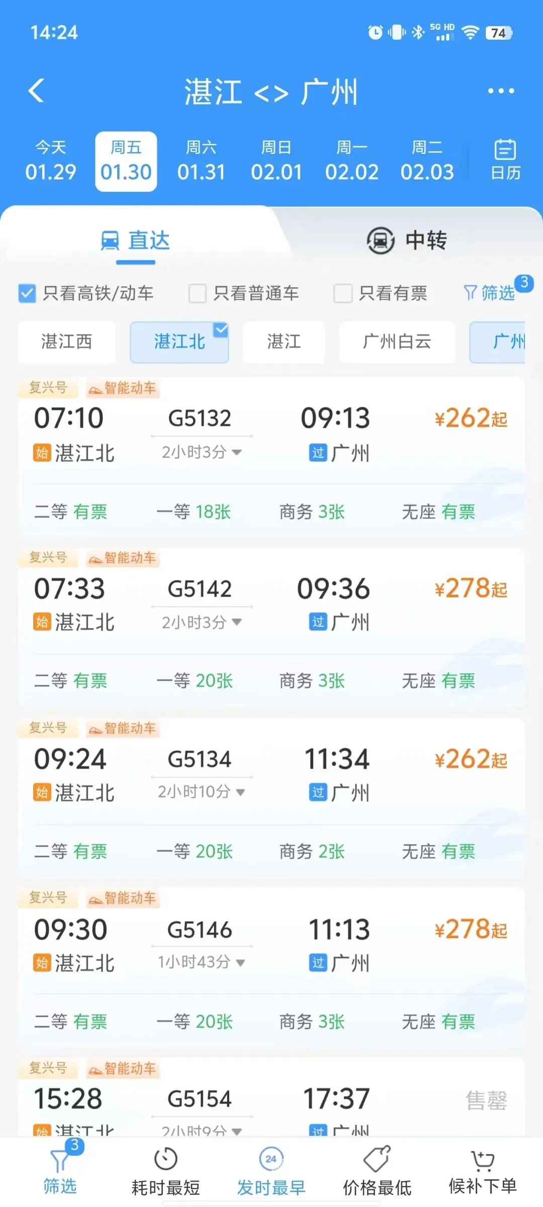 1月30日起,开行湛江北—深圳G5142/3次、G5154/5次、G5146/7次、G5158/9次,开行湛江北—汕头G5134次、G5132次、G5140次;