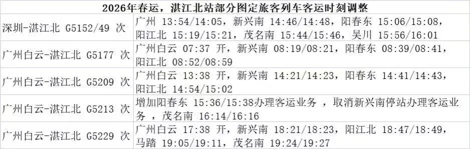 此外,深圳-湛江北G5152/49次、广州白云-湛江北G5177次、G5209次、G5213次、G5229次列车客运时刻进行调整。