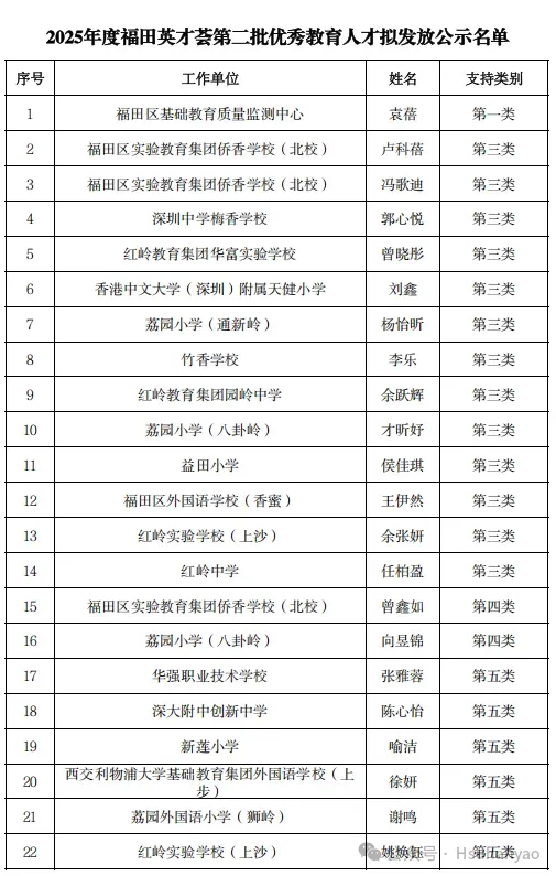根据《关于实施福田英才荟政策的若干措施(2025)》(简称“英才荟4.0政策”)、《福田区重点行业人才支持与认定办法》及《福田英才荟优秀教育人才支持申请指南》有关内容,现对我区教育系统符合条件的2025年度第二批次优秀教育人才予以公示(名单见附件)。