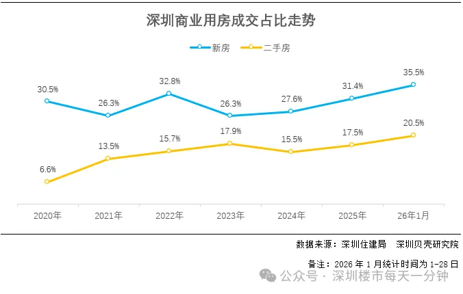 2026开年,深圳房地产市场迎来强势回暖。据深圳贝壳研究院统计,截至1月28日,深圳新房、二手房成交总量已达9741套,全月预计突破万套。受政策利好驱动,商业用房成交占比攀升并创下近年新高,其中新房商业用房成交占比达35.5%、二手房商业用房成交占比为20.5%。
