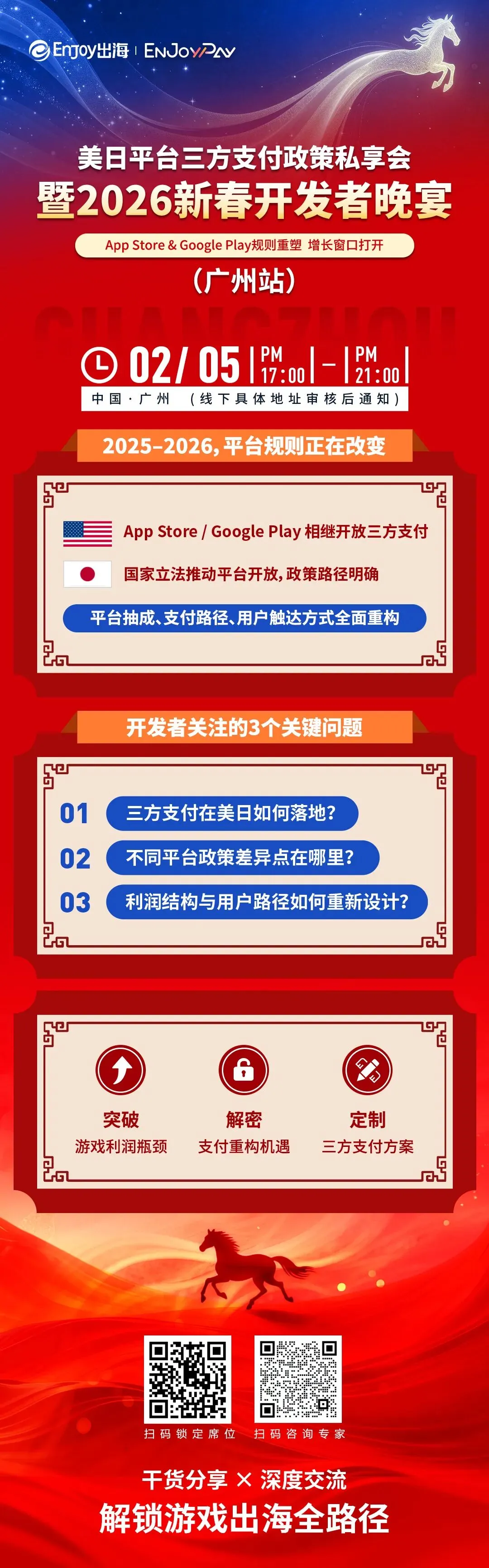 在这一关键节点,Enjoy出海&EnJoyPay将在2月5日举办「App Store & Google Play 美国、日本三方支付政策详解暨2026开发者新春私享晚宴(广州站)」,作为「2026 · 拓局跨年分享」系列活动之一,聚焦T1市场,直面平台松绑后的真实变化。
