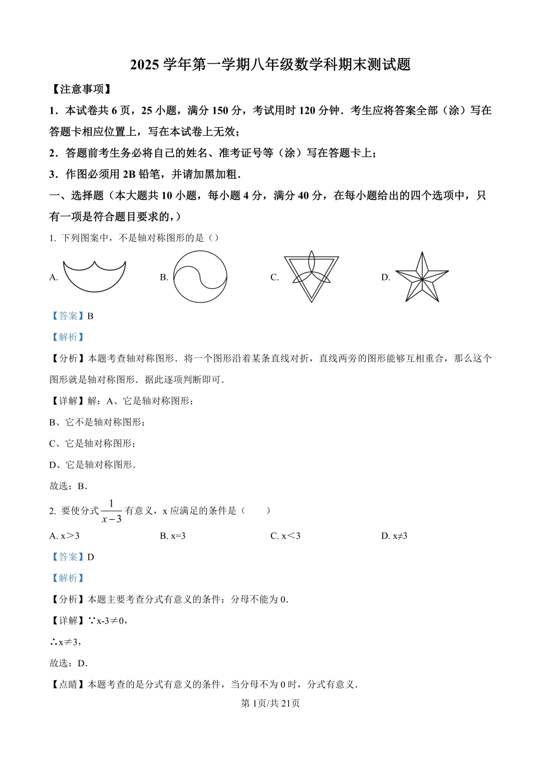 本卷全面考查轴对称、全等三角形、整式运算等核心内容,10道选择题基础性强,等几何作图题体现空间想象能力;得分点集中在科学记数法、因式分解等基础运算,难点在于第25题等边三角形综合证明,需结合旋转构造辅助线,阅读理解题创新性强,要求从材料迁移解法,综合题注重数学建模与逻辑推理的深度融合。