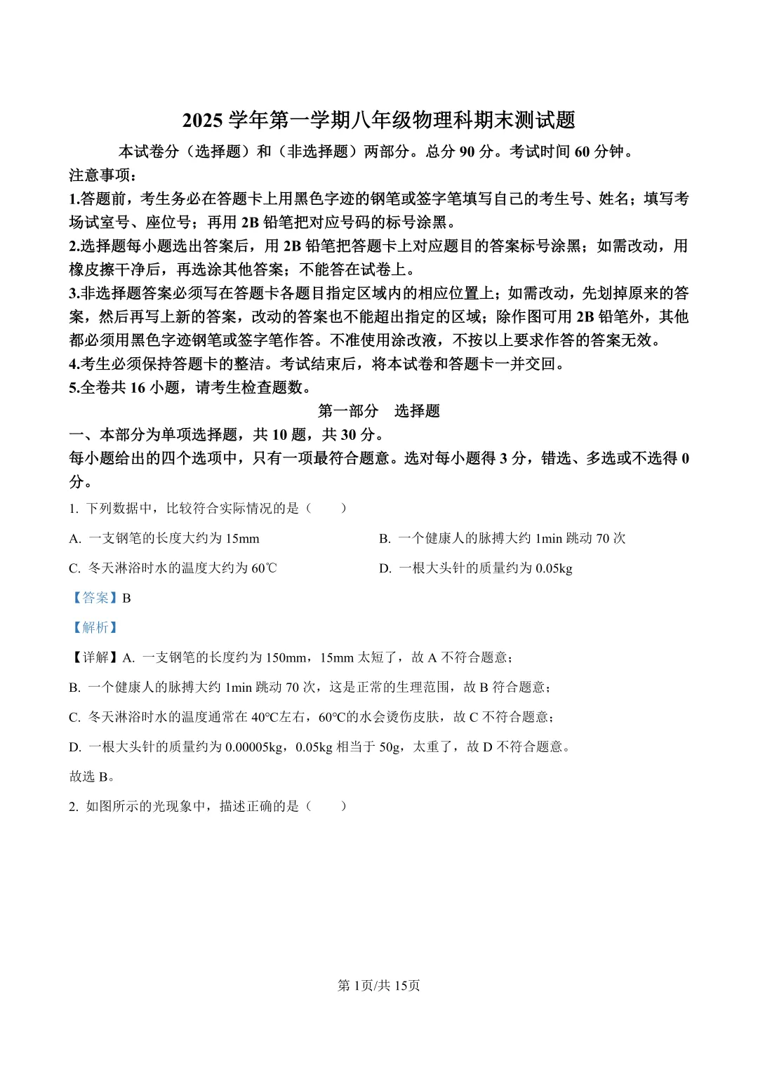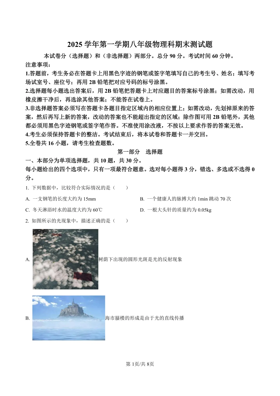 本卷全面覆盖物态变化、光学、运动学等核心内容,10道选择题系统考查物理量估算、光现象识别等基础知识,等实验题体现物理探究素养;得分点集中在物态变化判断、速度计算等基础题目,难点在于第16题隔音材料对比实验设计,需控制变量分析声学特性,综合题注重物理知识与生活实际的联系,但高阶思维题目比例可进一步提升。