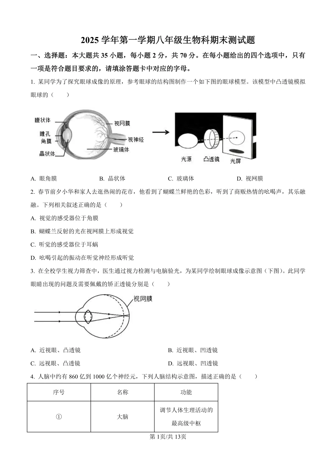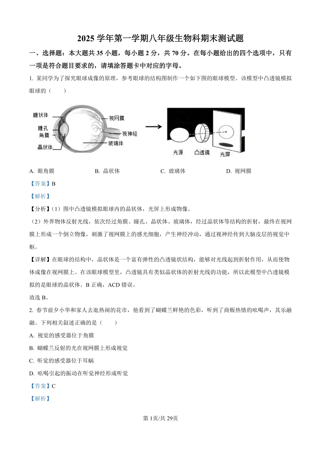 本卷全面覆盖人体生理健康、生态系统等核心内容,35道选择题系统考查神经系统、免疫系统等基础知识,等图表题体现生物实验素养;得分点集中在反射弧结构、传染病预防等记忆类题目,难点在于生态系统能量流动分析、重金属传递实验设计等综合应用题,需结合进行跨知识点推理,非选择题中急救操作、健康生活方式等情境较好体现生命教育导向。