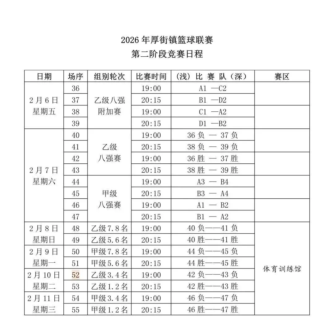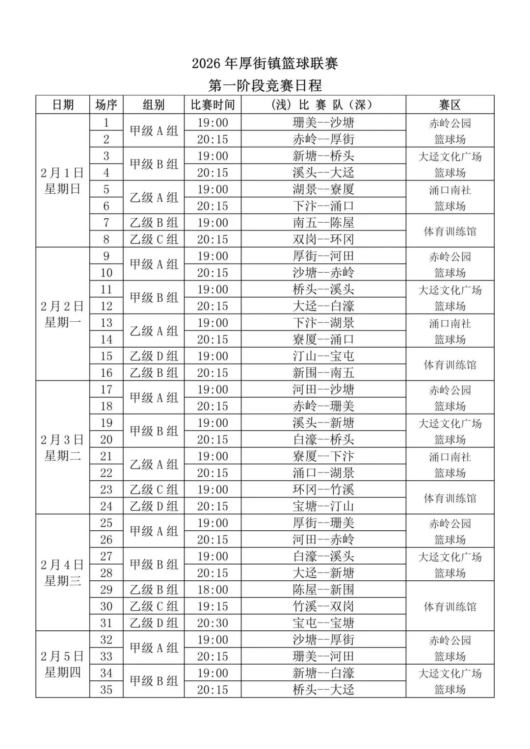 赛事将持续至2月11日晚。比赛将在体育训练馆、赤岭公园篮球场、大迳文化广场篮球场及涌口南社篮球场进行。
