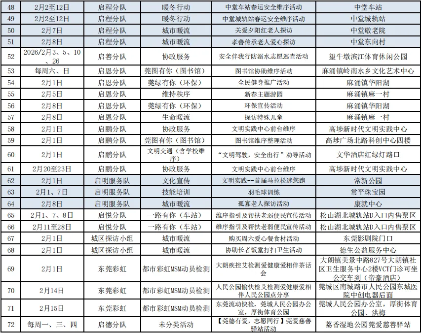 东莞市志愿者拓展服务总队(简称 “拓展总队”)于 2005 年底启动组建,2007 年 1 月 28 日正式成立。历经 19 年深耕,截至 2025 年 12 月 ,拓展总队注册志愿者已达13 万余人。2014 年 6 月,依托拓展总队成立社会团体东莞市爱心志愿者协会。