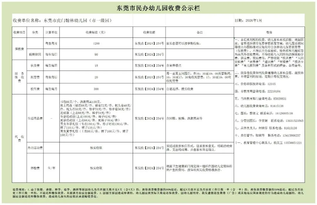 >东莞市虎门翰林幼儿园2026年春季学期教育收费情况公示