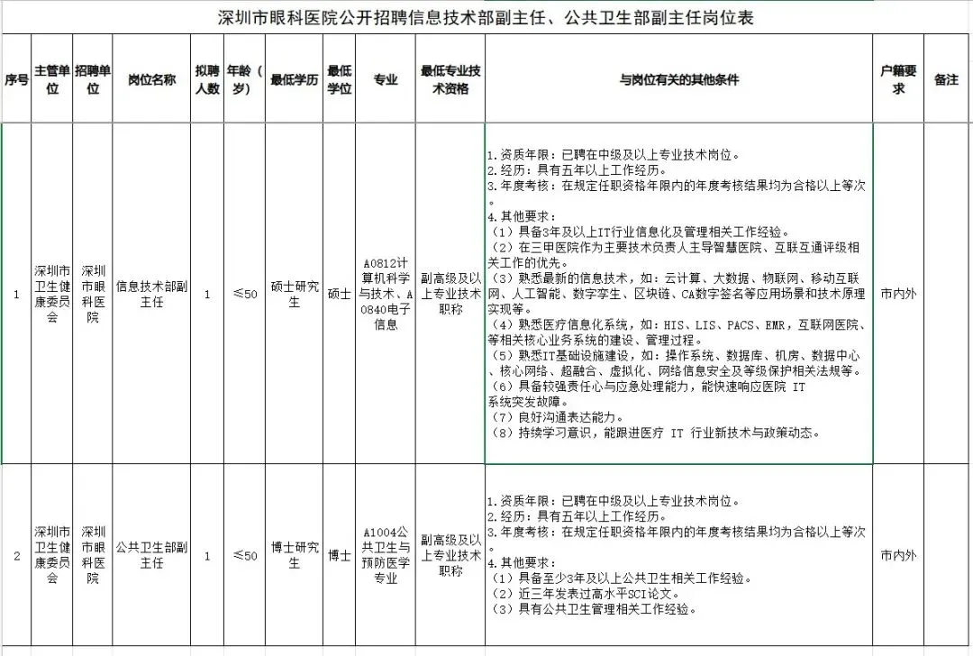 深圳市眼科医院创建于1983年,位于深圳市福田区,是深圳市唯一一家三级甲等市属公立眼科专科医院。医院是集医疗、教学、科研为一体的现代化眼病防治专科医院,是国家眼部疾病临床医学研究中心、国家临床重点专科(建设单位)、深圳市眼病防治研究所、深圳市眼科学重点实验室、深圳眼库、深圳市眼科学临床技能培训中心的依托单位,是深圳市博士后创新实践基地及广东省两家“中国日间手术联盟”医院之一,是深圳市医防融合眼科学项目组牵头单位。医院共有员工700余人,医生研究生以上学历占80.73%,副高及以上职称占44.27%,年门急诊量约68.6万人次,住院患者超3.7万人次,其中日间手术占择期手术比例98.16%(手术室口径),三四级手术占比94.49%,CD型病例占比95.38%,平均住院日1.12天。为进一步强化医院管理团队建设,提升信息技术支撑能力与公共卫生服务水平,契合医院高质量发展需求,经医院研究,决定面向社会公开招聘信息技术部副主任、公共卫生部副主任各1名(非编制管理岗位),具体岗位详见《圳市眼科医院公开招聘信息技术部副主任、公共卫生部副主任岗位表》(附件2-1,以下简称《岗位表》)。现就有关事项公告如下:一、应聘人员条件及要求(一)基本条件。1.具有中华人民共和国国籍。2.遵守宪法和法律。3.拥护中国共产党领导和社会主义制度。4.具有良好的政治素质和道德品行。5.适应岗位要求的身体条件。6.招聘公告要求的其他条件。(二)有关要求。1.关于招考范围。户籍要求为“市内外”的岗位,符合条件的中国公民均可报考。2.关于报考专业。(1)应聘人员所学专业须与《岗位表》要求一致,专业是否相符可参考《广东省2025年考试录用公务员专业参考目录》(附件2-2),国外学历学位证未明确标注专业的,以学历学位认证书为准,学历学位认证书未标注的,提供相关证明材料(毕业论文、成绩单等)。应聘人员所学专业未列入专业目录(没有专业代码)的,可选择专业目录中的相近专业报考,所学专业必修课程须与报考职位要求专业的主要课程基本一致,并在直接业务考核前资格复核时提供毕业证书、所学专业课程成绩单、课程对比情况说明及毕业院校设置专业的依据等材料。如招聘岗位专业条件为“XX专业”(代码为6位数),应聘人员所获毕业证书上的专业名称为该“专业”的上一级“学科”(代码为4位数)或“学科门类”(代码为2位数),可按前述规定以相近专业报考。(2)所学专业须与《岗位表》规定的学位层次相对应。(三)有下列情况之一的,不接受报名。1.受过刑事处罚的;2.被开除中国共产党党籍的;3.被开除公职的;4.被依法列为失信联合惩戒对象的;5.法律、法规规定的其他情形。