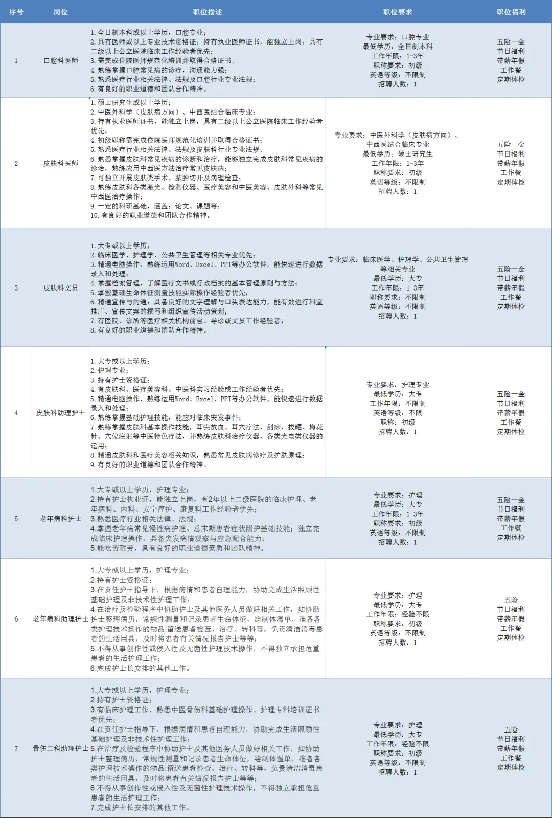 因医院业务发展需要,现需招聘合同制口腔科医师1名、皮肤科医师1名、皮肤科文员1名、皮肤科助理护士1名、老年病科护士1名、老年病科助理护士1名、骨伤二科助理护士1名。具体要求如下表: