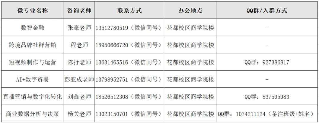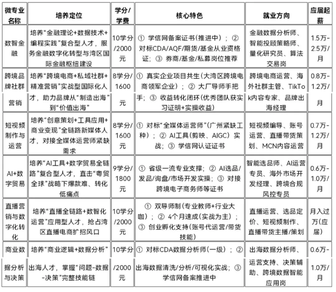 岗位推荐:覆盖智能投顾、量化研究、海外社群、直播运营、数据分析等高需求岗,部分专业(如数智金融)为“校内唯一金融类微专业”,享优质岗位优先推荐权;