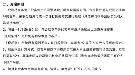 此外,杰我睿强调,公司将在监管下把实物资产逐渐变现,因变现需要时间,公司将针对与公司达成和解的客户,采取分期兑付或一次性打折的方式进行处理。杰我睿同时强调,1月26日起符合条件客户可继续按原规则限额提现(每日500元或1克黄金)。