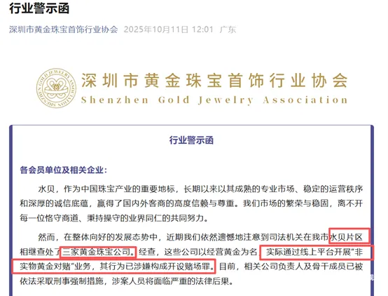 同年10月份,深圳市黄金珠宝首饰行业协会曾发布行业警示函。该函显示,司法机关在水贝片区相继查处了三家黄金珠宝公司。