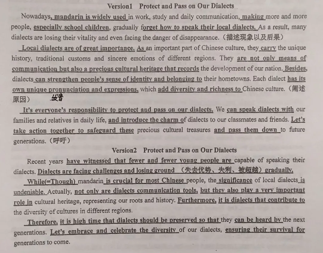 收到一个高中学生的请求,应用文,作文题是关于"Protect and Pass on Our Dialects"(保护并传承方言)的。他说,我觉得很好写啊,但是分数不高。为啥呢?