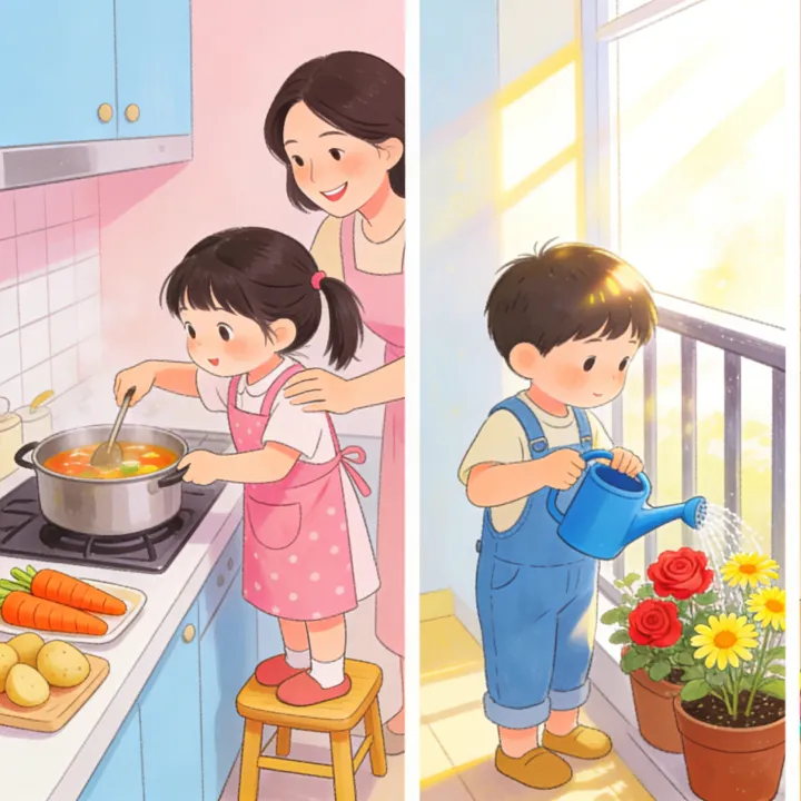 在厨房帮妈妈一起做菜,在阳台帮爸爸浇一株植物、为家人画一幅画、在点滴小事中学会感恩家人;