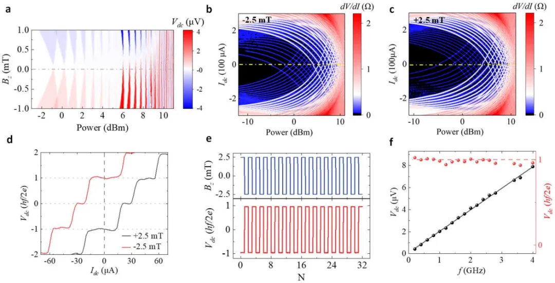 在射频信号的驱动下,由于约瑟夫森二极管的正负超导临界电流不同,电流-相位关系不具有对称性,在超导临界电流更小的方向,相位粒子的斜搓衣板势垒更陡,使得相位粒子更容易朝这个方向移动,产生整流电压。相位粒子的移动频率与射频信号同频,因此产生的整流电压与射频频率成正比,即为量子化的整流电压。约瑟夫森二极管的极性可以由磁场的方向控制,因此量子化的整流电压极性也可以在磁场控制下翻转。量子化整流的实现使得超导二极管从原来的低频信号处理扩展至射频频段,并且大幅提高了整流精度。