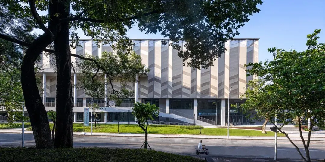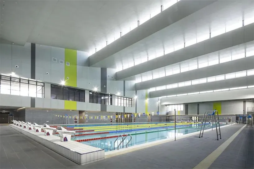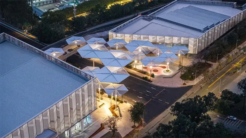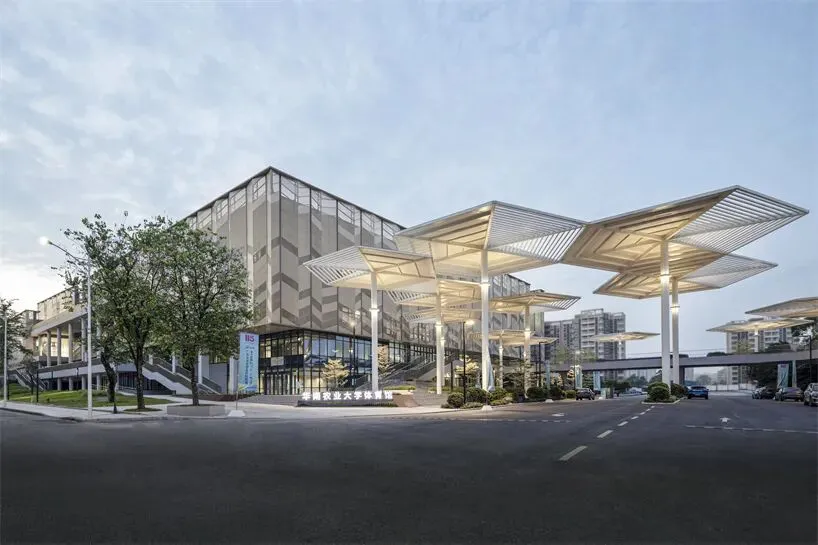 在比赛馆和游泳馆的拐角处,一个对角线状的建筑体量围合出一个小广场,广场内设有滑板场、冷饮吧、楼梯和休闲廊,可供开展体育和社交活动。20个以大学标识“花蕾”为灵感的顶篷式遮阳结构,营造出一个以树为主题的社交中心。这些顶篷适应亚热带气候,提供全天候遮阳和舒适的微气候,增强师生的日常互动。建筑立面上的步行拱廊将树冠广场、休闲平台和休息区连接成一个开放的街区,室内活动则透过落地玻璃幕墙清晰可见,模糊了室内外界限,促进了社区参与。