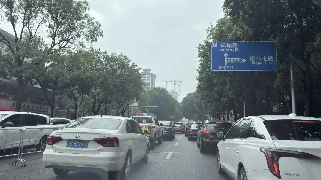 行车到宏伟三路阳光实验中学路段,遇到了大堵车。当天学生放假,大巴及接送学生的私家车汇聚,很堵。有不少社会车辆误入此路段,加剧拥堵。