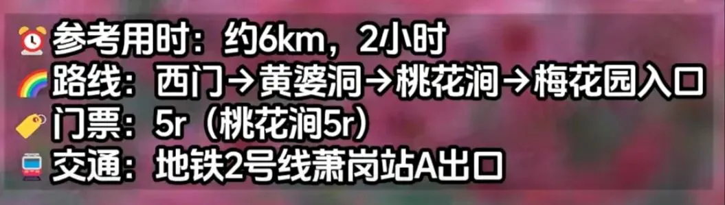 从西门到梅花园入口约六公里,途经桃花涧5.5万平米桃花海,正值盛花期。