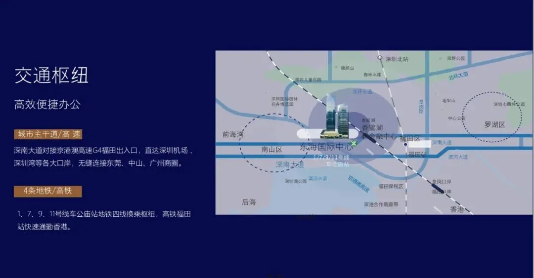 海、陆、空、轨,多维立体交通路网辐射粤港澳大湾区,负一层直连地铁1/7/9/11号线车公庙站,20多分钟直达深圳湾口岸,半小时直抵宝安国际机场,以高效商务咫尺世界。