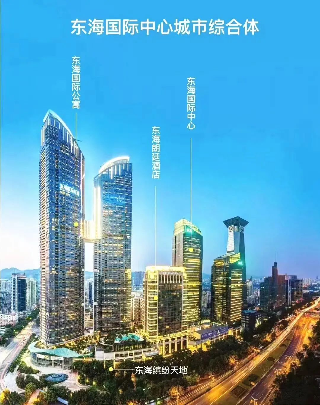 由甲级写字楼、五星级朗廷酒店,308米高东海国际公寓及大型旗舰商城东海缤纷天地组成。