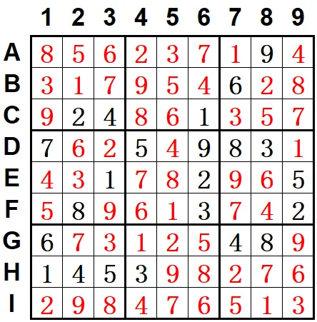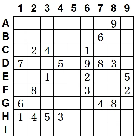对九宫排除得H9=6,G9=9,则I8=1,I2=9,G2=7。唯余得G6=5,B6=4,则I6=6,A6=7,C9=7,A9=4,D9=1,D5=4。如下图: