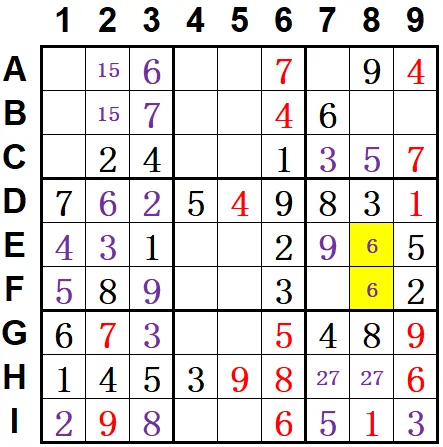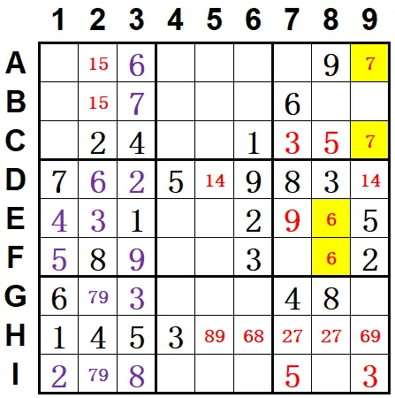 观察盘面,宫排除得D3=2,I1=2,F1=5,E1=4,E2=3,F3=9,I3=8,G3=3,唯余得D2=6。七宫余79数对,3列B3=7,A3=6。如下图: