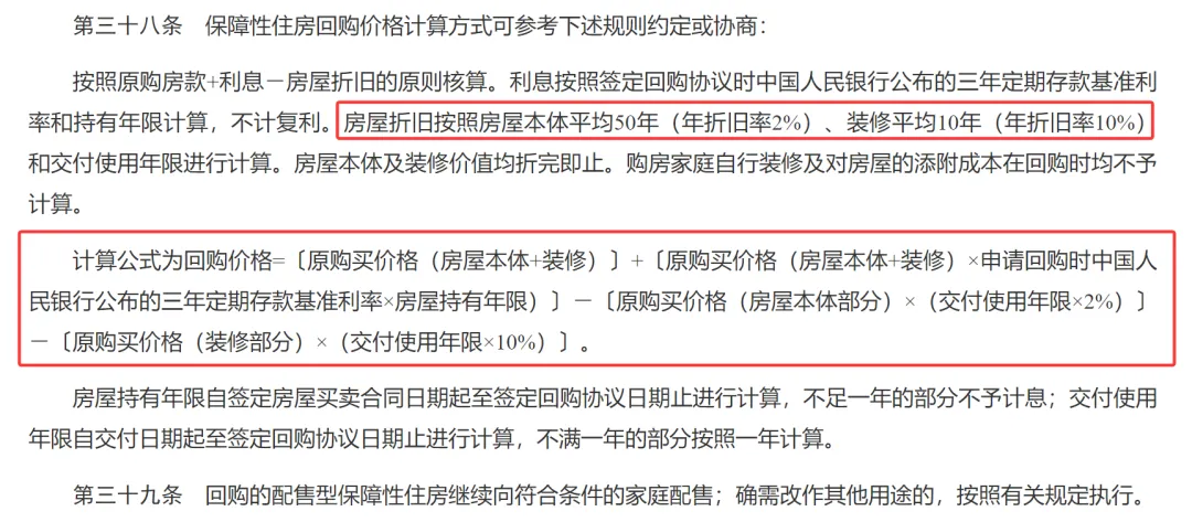 再比如2025年7月7日大庆市发布的《大庆市配售型保障性住房管理办法》显示,配售型保障性住房的回购价格为〔原购买价格(房屋本体+装修)〕+〔原购买价格(房屋本体+装修)×申请回购时中国人民银行公布的三年定期存款基准利率×房屋持有年限)〕-〔原购买价格(房屋本体部分)×(交付使用年限×2%)〕-〔原购买价格(装修部分)×(交付使用年限×10%)〕,房屋折旧按照房屋本体平均50年(年折旧率2%)、装修平均10年(年折旧率10%)。