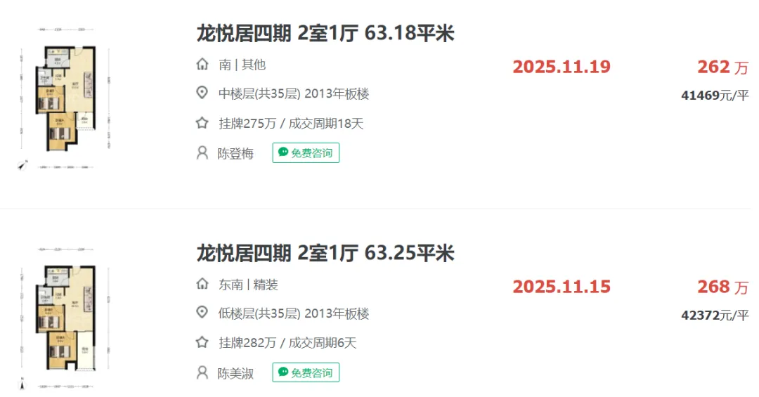 去年11月龙悦居四期就分别成交两套约63平户型,一套成交总价约268万,折合单价约4.24万/平,一套成交总价约262万,折合单价约4.15万/平。