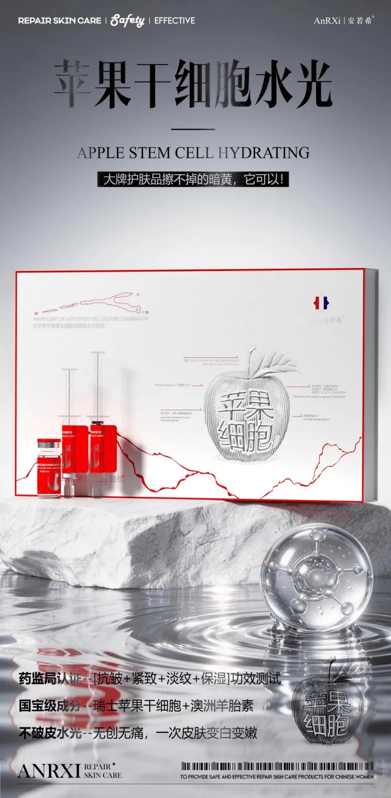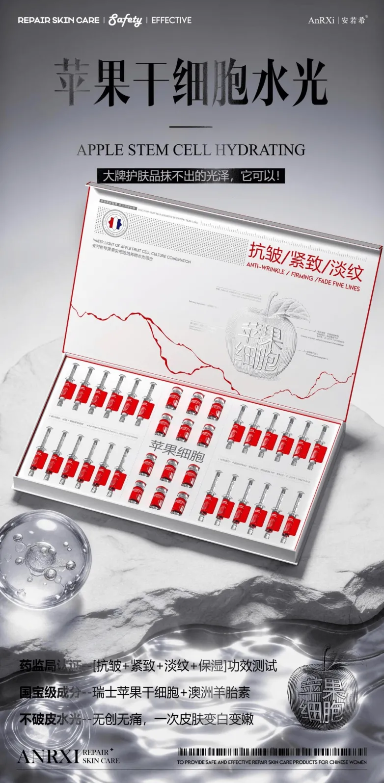 安若希甄选两大国宝级作为苹果干细胞水光的核心成分——瑞士苹果干细胞与澳洲羊胎素。瑞士苹果干细胞提取自瑞士阿尔卑斯山脉海拔3700多公尺林中的“乌尔斯特”苹果,这种源自18世纪的濒危品种苹果,具备强大的自我修复能力与保鲜能力。安若希医学护肤品研发中心选用高纯度瑞士苹果干细胞作为核心成分,经植物干细胞培养技术完整保留其DNA 中的再生密码,可有效延长细胞寿命、促进人体80%的细胞再生,抗老化能力突出,已广泛应用于保健品、化妆品、临床医学等领域,连续斩获多项行业重磅奖项。澳洲羊胎素则甄选来自澳洲无污染牧场的优质原料,该产区遵循当地农业与兽医局规范,确保羊群生长环境洁净、饲料无添加。原料提取自受孕40-60天的美利奴羊胚胎或新鲜胎盘,此阶段胚胎 / 胎盘生物活性最强。采用新一代高科技微乳化技术提取,无任何人工化学添加剂,严格遵循澳洲药监局(TGA)原料要求及国家GMP级生产标准,同时坚持本土化提取加工,避免原料长途运输导致的活性流失。澳洲羊胎素富含80%以上蛋白质、17种氨基酸、14种微量元素及多种活性多肽、生长因子,可增加细胞分裂次数,激发衰退或老化细胞,实现美容抗衰作用。两大成分协同作用,形成1+1>2的护肤效果,从细胞层面根源解决干燥、暗沉、粗糙三大皮肤问题。