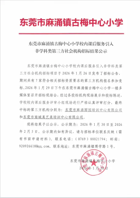 东莞市麻涌镇古梅中心小学学生校内课后服务项目公开招标结果公示如下,予与社会监督!公示期为:2026年1月30日至2026年2月5日。
