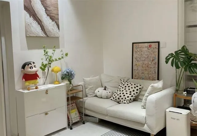 玄关旁边就是客厅,一张小小的白色沙发,配上黑白波点抱枕和奶牛靠垫,简单但很有设计感.姑娘说,下班后窝在这张沙发里,一天的疲惫都能消散,这才是家该有的样子啊!