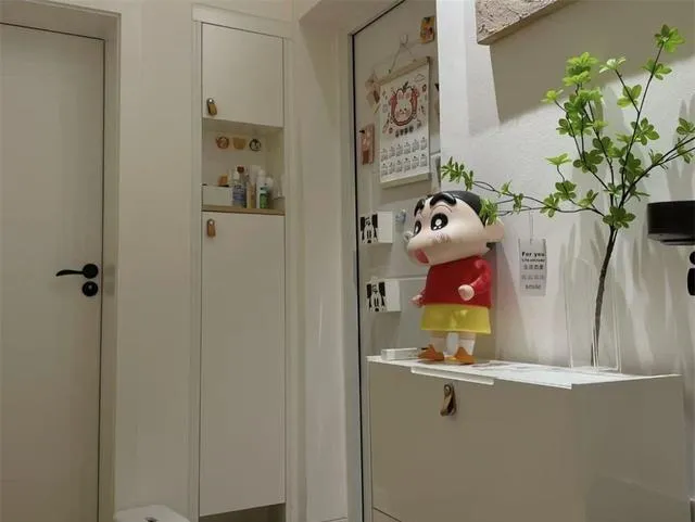 一进门,玄关真的很小很小,但你看人家怎么做的?一侧做了通顶窄柜,收纳家居杂物和零碎物品,底下留空放常穿的鞋子,旁边还摆了个蜡笔小新的矮柜当鞋柜.